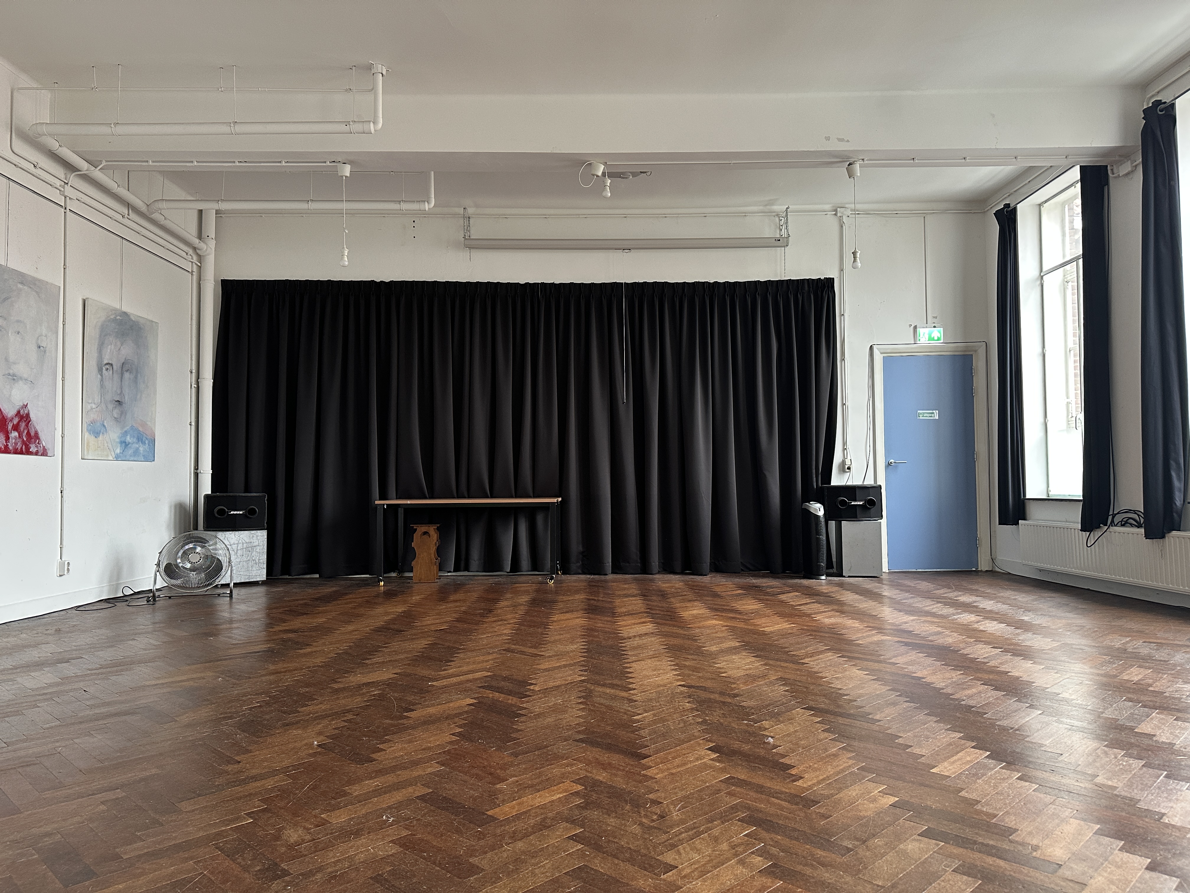 Een veelzijdige ruimte op de eerste verdieping met authentieke parketvloer. Perfect voor kleinschalige voorstellingen, exposities en bijeenkomsten.